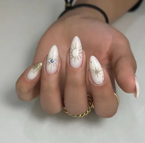 Белая база и снова солнце, но здесь акценты более смелые. Крупные золотые линии и добавление символа «глаз» превращают дизайн в нечто вроде оберега. Маникюр смотрится как аксессуар сам по себе, но его легко представить в паре с кольцами и браслетами. Почти идеальный образец бохо-стиля.