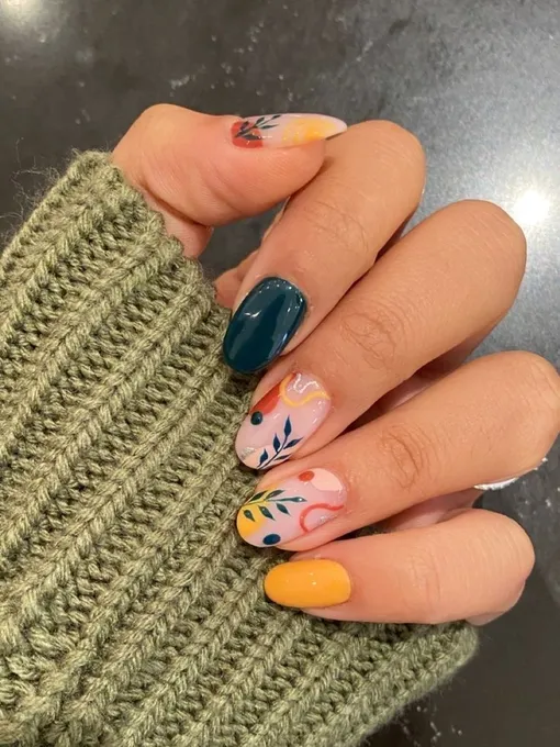 Следующий вариант яркий, жизнерадостный и очень свободный. Здесь мы видим и насыщенный зеленый акцент, и желтый, и абстрактные узоры с листьями и волнами. Маникюр словно иллюстрирует само лето — теплый, насыщенный, с легкой хаотичностью. Отличный выбор, если хочется добавить в образ больше красок.