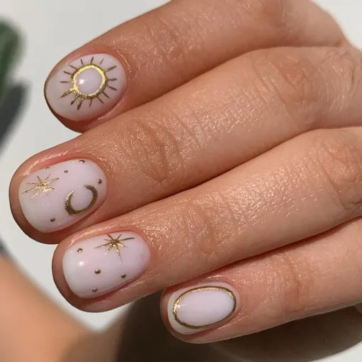 Первый дизайн играет на контрасте классики и магии: нежный френч с асимметричной линией дополнен золотыми солнцами и звёздами. За счет этого простая база превращается в стильный бохо-вариант, который смотрится и элегантно, и чуть загадочно.