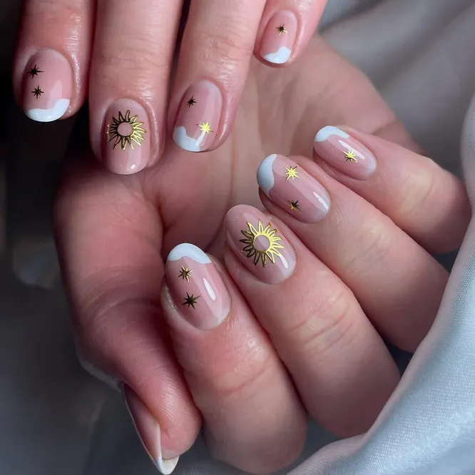 Первый дизайн играет на контрасте классики и магии: нежный френч с асимметричной линией дополнен золотыми солнцами и звёздами. За счет этого простая база превращается в стильный бохо-вариант, который смотрится и элегантно, и чуть загадочно.