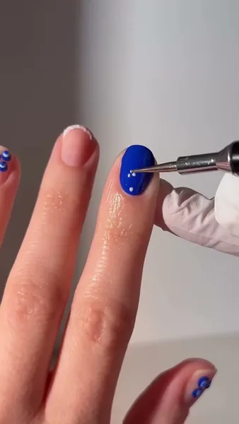 - Остальные ногти можно покрыть синим цветом и украсить их голубыми точками.