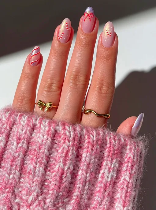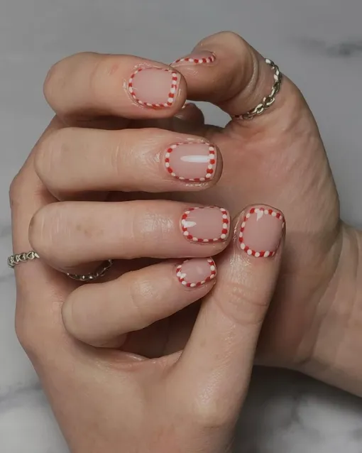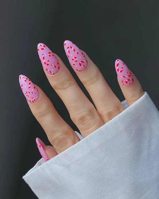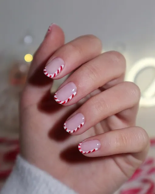 Нам очень нравится эта одновременно элегантная и забавная вариация. Крохотные карамельные трости идеально вписываются в изгибы ногтевой пластины и придают рукам аккуратный вид.