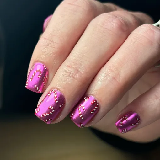Хром был невероятно популярен весь год. Встречай праздник, объединив этот тренд с карамельными рисунками! Наложи «конфетные» полоски на ультрамодный хром, и маникюр заиграет праздничными неоновыми красками.