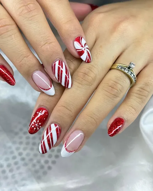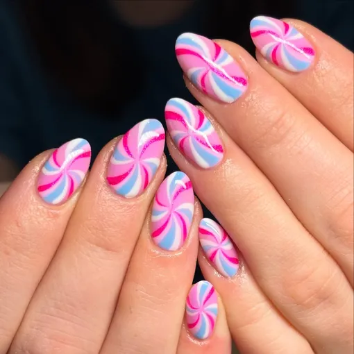 Это, скорее, дизайн-фантазия на тему зимней новогодней карамели. Гигантский леденец на ногтях будет вдохновлять тебя поверить в чуда в ожидании праздника!