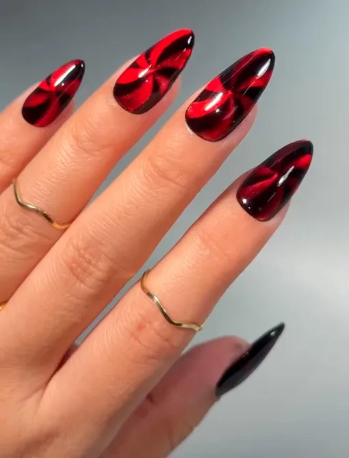 Есть в этом маникюре что-то гипнотическое. Рисунок одновременно напоминает леденец на палочке и вместе с тем завораживает бесконечным карнавальным водоворотом красного и белого цветов.