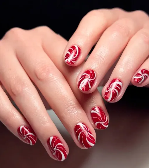 Позволь красно-белым полосам уверенно закрутиться по всей длине ногтей, создавая гипнотический ритм. Такой маникюр виртуозно повторяет расцветку знаменитого леденца, мгновенно приковывая взгляды.