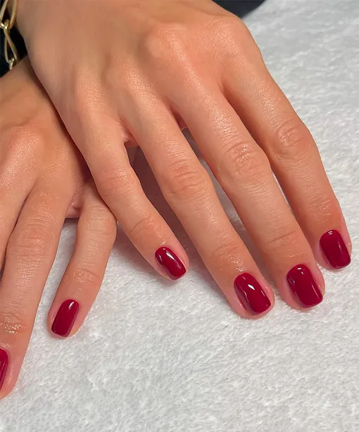 Что может быть лучше идеально ровного и глянцевого покрытия цвета клюквы на аккуратно обработанных и коротко подпиленных ноготках? Позволь главному оттенку сезона говорить самому за себя и не добавляй ничего лишнего.