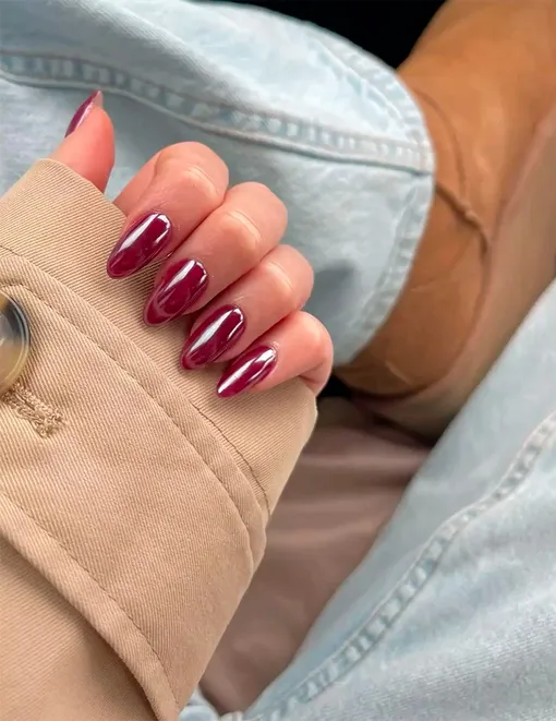 Еще более нарядным и волшебным маникюр в ягодном оттенке будет выглядеть под деликатным сиянием втирки. С ней ноготки будут напоминать алые ягоды клюквы, покрытые тонким слоем сахарной глазури.
