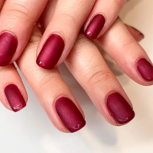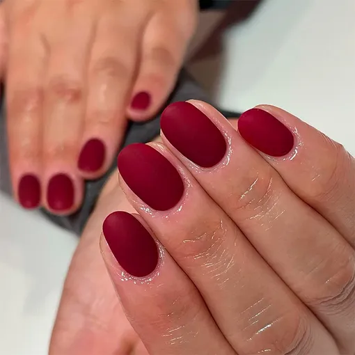 Матовые текстуры особенно уместно смотрятся в осенне-зимних вариантах дизайна, ведь способны мгновенно добавить образу уюта и теплоты. Сочный оттенок клюквы, покрытый матовым топом, вдобавок будет смотреться еще и очень нарядно!