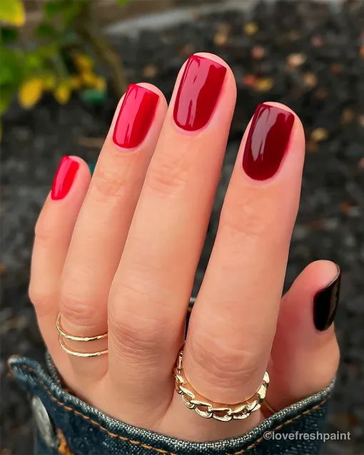 Красный маникюр остается фаворитом вне зависимости от сезона года. При этом отступ всего на один тон в палитре стирает грань между традиционно осенним бордовым и рождественнским алым цветами. Идеальным вариантом для этого переходного от осени к зиме сезона можно смело назвать клюквенный маникюр.