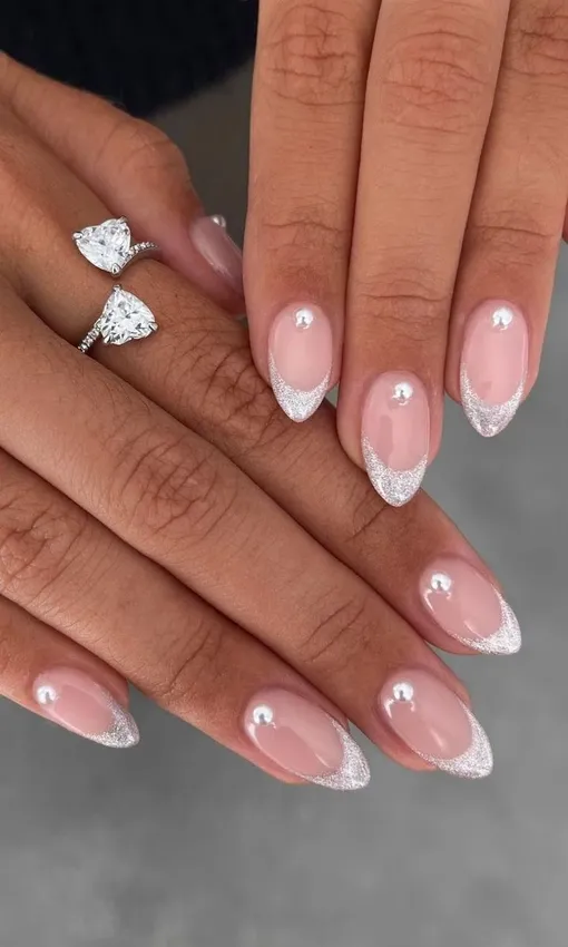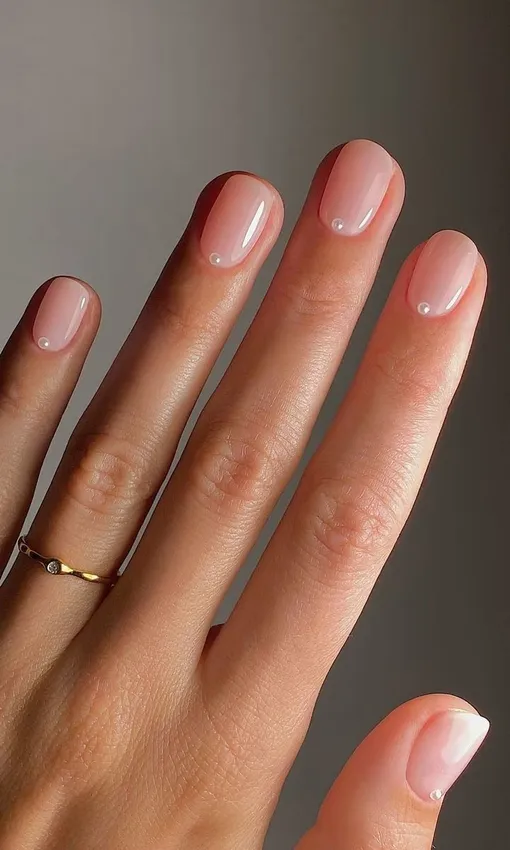 Идеальный вариант для женщин, которые не любят экстремальную длину. Нежно-розовый нюд на коротком овале, дополненный аккуратными бусинами на лунках, станет твоим тайным оружием против возраста.