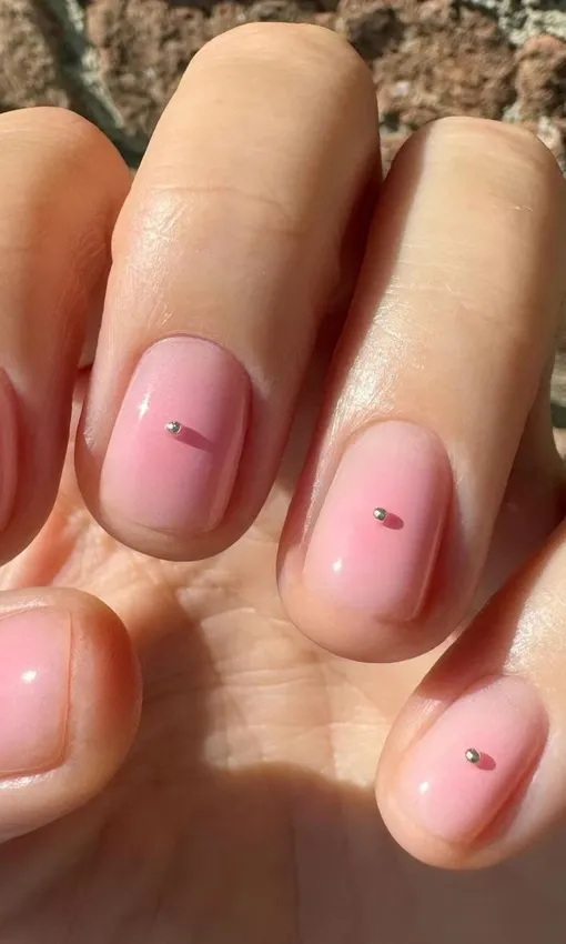 Тренд на румяные ногти можно легко сочетать с антиэйдж-фишкой. Достаточно будет дополнить маникюр крошечными бусинами, которые будут отвлекать внимание от всего ненужного.