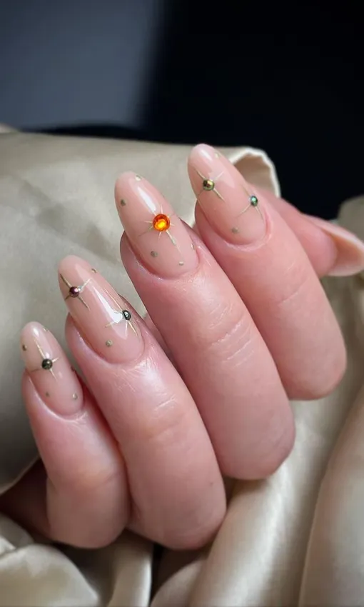 Нюдовая основа служит как будто продолжением пальцев, а разноцветные стразы, оформленные в звезды, добавляют маникюру роскоши и гламура.