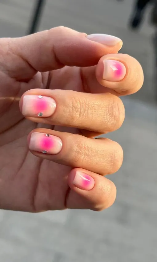 Модный аура-маникюр тоже может быть омолаживающим. Главное — выбрать деликатные оттенки, правильно расставить цветовые акценты и зафиналить всю композицию небольшим количеством страз!