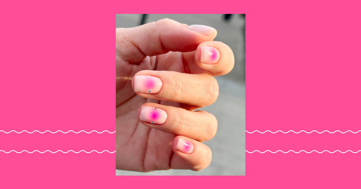 Модный аура-маникюр тоже может быть омолаживающим. Главное — выбрать деликатные оттенки, правильно расставить цветовые акценты и зафиналить всю композицию небольшим количеством страз!