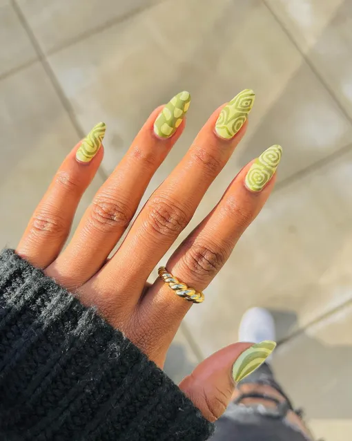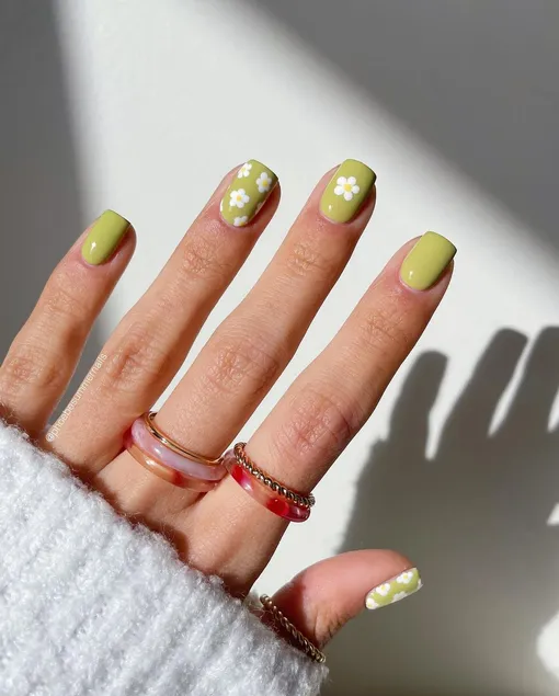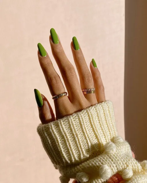 Нейл-арт в этом спокойном, но при этом довольно сочном цвете станет идеальным вариантом в межсезонье. Он хранит в себе теплые воспоминания о лете и одновременно настраивает на уютную атмосферу осени. Оттенок зеленого выбирай по настроению: это может быть как землистая, так и нежная кремовая матча.