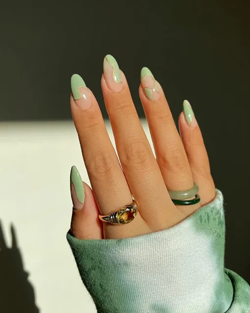Любишь минималистичные нейл-дизайны? Тогда перед тобой едва ли не самый гармоничный способ включить в свой лаконичный маникюр трендовый оттенок весны. Мятный цвет в этом варианте с золотистыми контурами по сути выполяет функцию нейтрального.