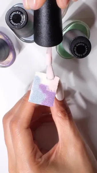 Это пастельное омбре из сплетения мятно-зеленого, барвинково-голубого, лавандового и персикового тонов напоминает стильный дизайн пасхальных яиц. Но до Пасхи еще целый месяц, поэтому ты пока можешь вдоволь поэкспериментировать с дизайном ногтей. К тому же повторить его невероятно просто: нанеси все вышеперечисленные цвета на губку или спонж и отпечатай получившийся узор на ногтях.