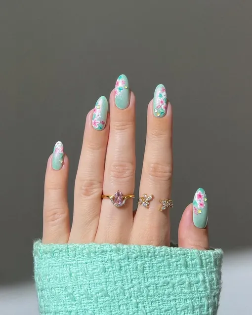 Куда же мы денемся этой весной без самого популярного принта сезона — флористического. Позволь самым нежным цветам распутиться именно на мятной основе, а в качестве гламурной нотки добавь в дизайн несколько сверкающих страз.