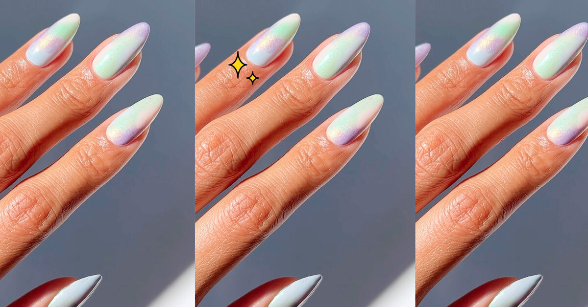 Это пастельное омбре из сплетения мятно-зеленого, барвинково-голубого, лавандового и персикового тонов напоминает стильный дизайн пасхальных яиц. Но до Пасхи еще целый месяц, поэтому ты пока можешь вдоволь поэкспериментировать с дизайном ногтей. К тому же повторить его невероятно просто: нанеси все вышеперечисленные цвета на губку или спонж и отпечатай получившийся узор на ногтях.