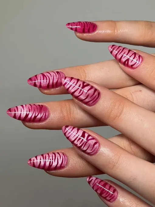 Примерь вечернюю версию этого «звериного» принта. Сделай основу нежно-розовой, а поверх нанеси тонкие бордовые полосы. Добавь глянцевый топ с мельчайшими частичками глиттера, который сгладит контраст и превратит твой маникюр в драгоценность.
