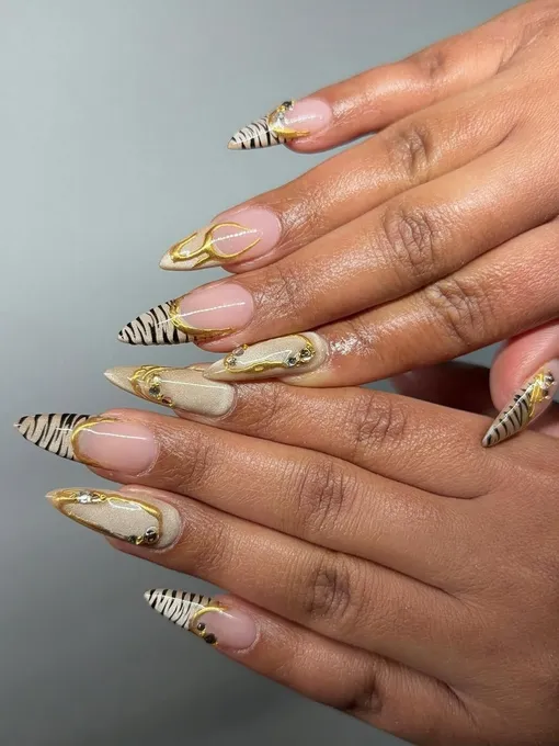 Оставь основу натуральной, тем самым подчеркнув естественную красоту ногтей. Выдели два акцентных ногтя: сделай на них френч в виде черных тигровых полос на бежевом фоне, а линию улыбки подчеркни тонкой золотой полосой для шикарного блеска. Остальные ногти покрой плотным бежевым нюдом и нанеси на них тонкую графику — изящные золотые и черные линии.