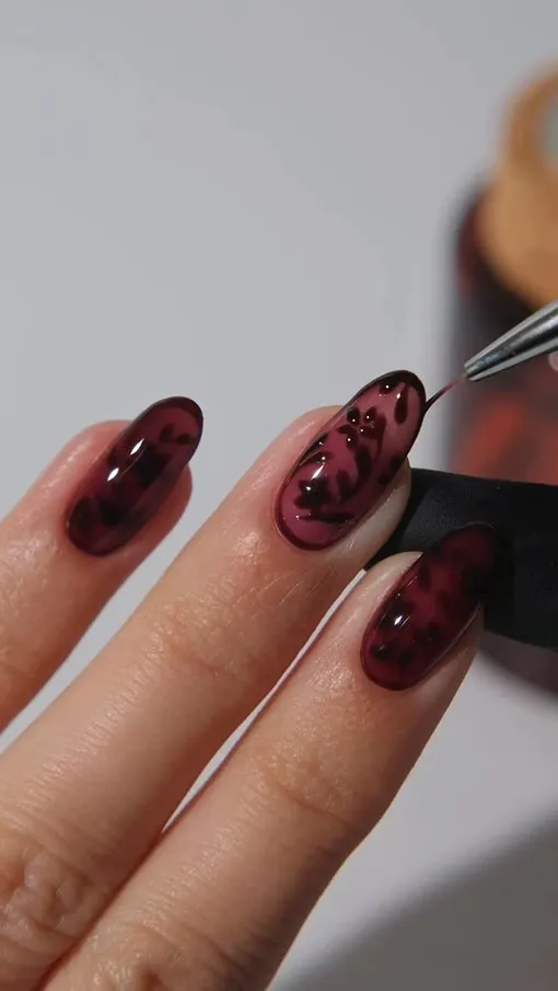 Основой модного маникюра служит темная палитра, в которой преобладают чернильно-черные, бордовые и баклажановые тона. На поверхность ногтей лаки в этом цвете выкладываются полупрозрачным и как будто «стеклянным» слоем, через который, словно через витражные окна собора в готическом стиле, просвечивают нежные рисунки цветов.