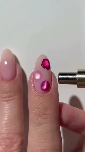 - Нанеси на ноготь пятно «кошачьим глазом» в виде неидеального круга, поднеси магнит, чтобы создать блик, высуши. Нарисуй так основу для всех трех роз.