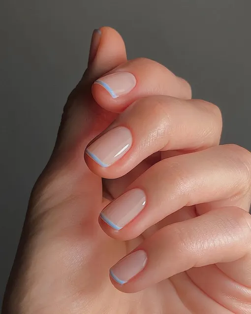 Аккуратный микрофренч с нежно-голубыми полосками напоминает о безоблачном небе, которым мы обычно наслаждаемся в особенно погожие весенне-летние деньки.