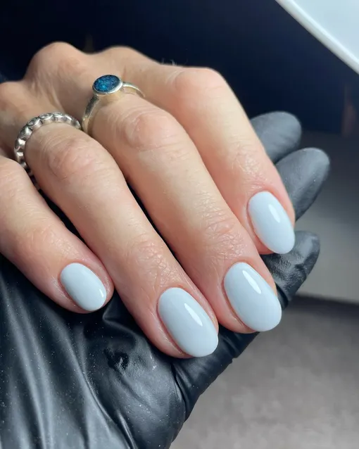 А этот маникюр в приглушенном нежно-голубом оттенке напоминает нам пену, которая остается на морском берегу после игриво накатывающих волн.