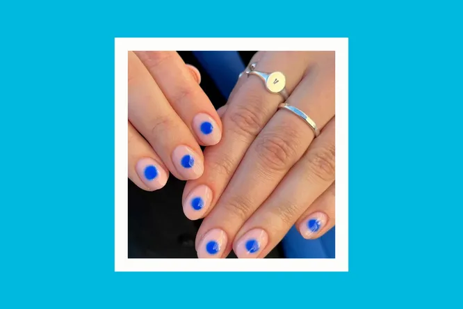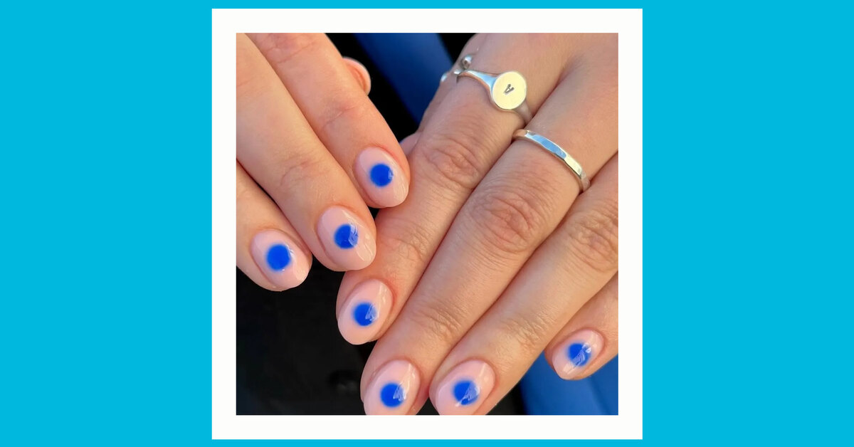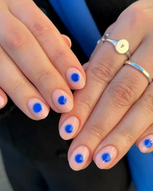Крупные точки на нюдовой базе напомнили нам известный на весь мир амулет в виде синего стеклянного глаза, который еще называют глазом Фатимы. Если вложить в такой маникюр особый смысл, то он может стать твоим личным оберегом от сглаза, который будет всегда с тобой.