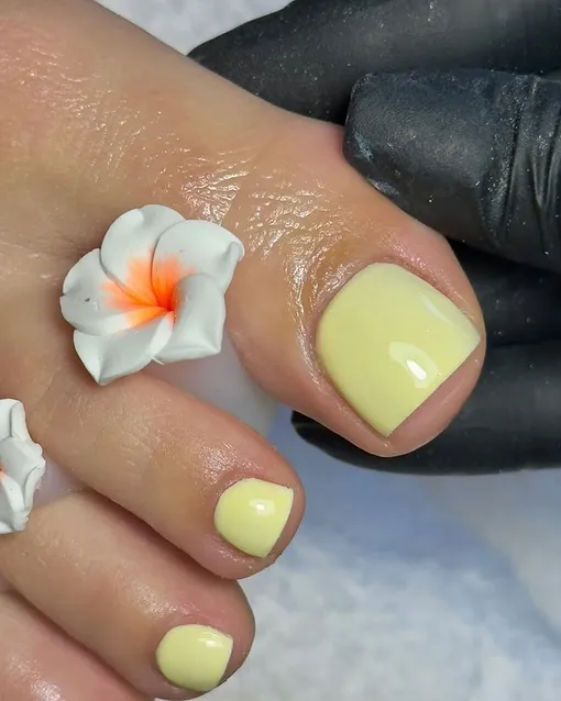 Этот нежный оттенок желтого — настоящий тренд сезона. Предлагаем не ограничиваться стильными вещами в гардеробе и маникюром в этом цвете, но и поэкспериментировать с педикюром. Это теплый тон идеален для весны или лета.