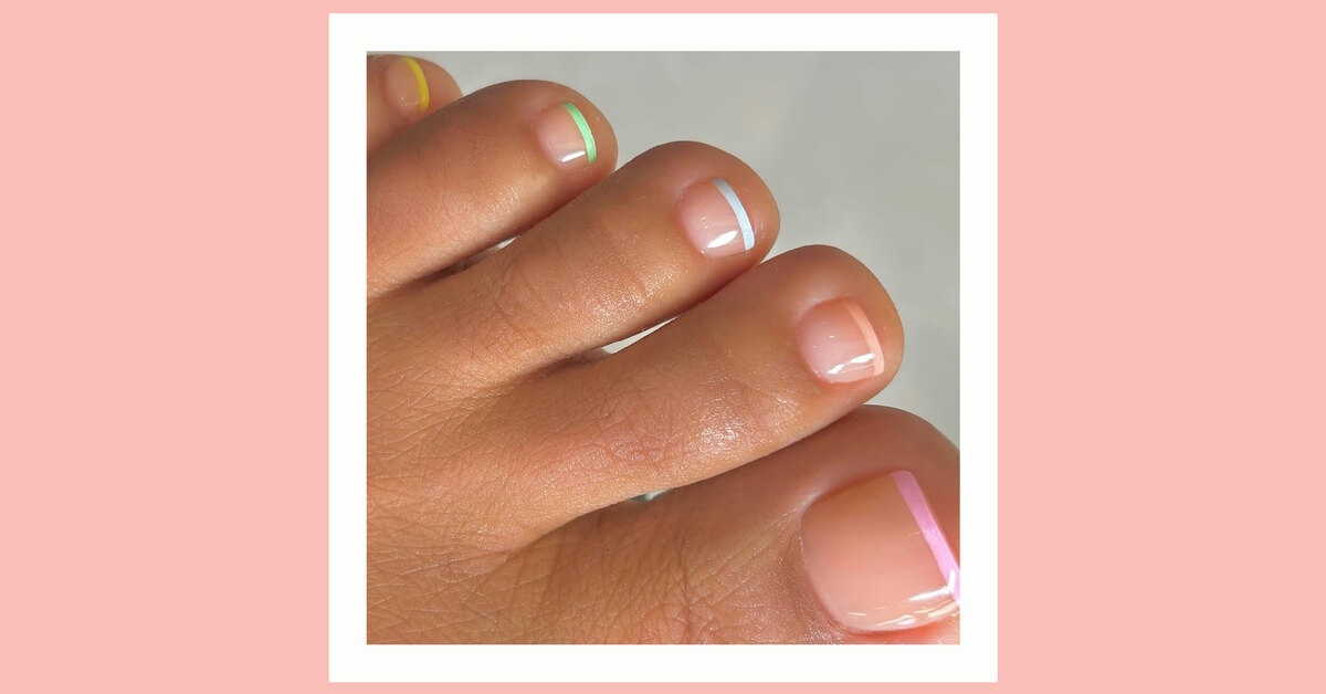 Френч на ногах — такая же классика педикюра, как нюд или красный. Но что если попробовать заменить белые «улыбочки» на кончиках на полоски в разных оттенках пастели. Салатовый, небесно-голубой, лимонно-желтый, перисиковый и нежно-розовый — не останавливайся на чем-то одном и укрась каждый пальчик своим цветом.