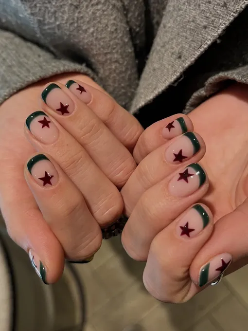 В этом сезоне классическая омела получила новое прочтение: на нюдовой основе засияли звезды ягодно-красного цвета, которые дополнены кончиками в глубоком лесном оттенке. Благодаря такой лаконичной нюдовой подложке дизайн смотрится максимально элегантно.