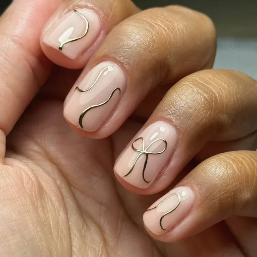 Этот дизайн доказывает, что рождественскому маникюру необязательно быть броским и помпезным, чтобы производить впечатление. Например, в этом варианте изысканный бантик и изящные изогнутые линии становятся праздничными благодаря деликатной золотой втирке.