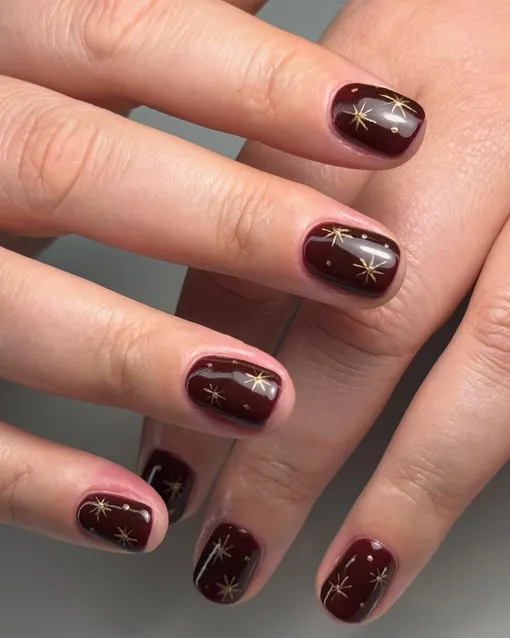 Насыщенная основа цвета горячего красного вина смотрится на ногтях по-настоящему аристократично, а золотые звезды лишь добавляют дизайну шарма. К такому маникюру так и хочется надеть платье в пол и отправиться на самую красивую новогоднюю вечеринку!