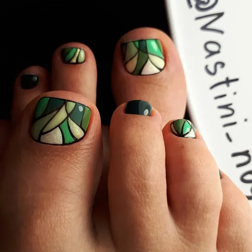 Соединяем несколько оттенков зеленого, добавляем чуть прозрачности, немного хаоса, и в итоге получаем почти витраж. Вживую такой педикюр смотрится еще круче. Особенно если добавить один-единственный золотой мазок для мерцания в движении.