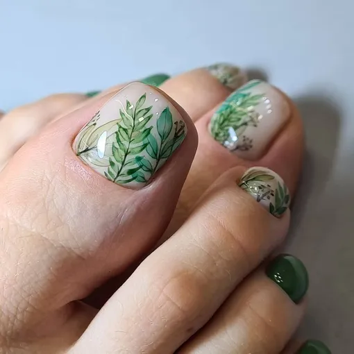 Монохромный зеленый шикарно сочетается с тонкими ветками, словно нарисованными акварелью. Такой педикюр смотрится будто эскиз из альбома натуралиста. Особенно хорош такой арт будет смотреться на загорелых ножках.С ним сразу же хочется надеть льняное платье и пойти гулять босиком по траве.
