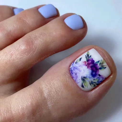 Пастельные оттенки базы классно сочетать с цветочными слайдерами. Такой флористический арт всегда выглядит свежо, ненавязчиво, благодаря чему очень оживляет образ. Матовый топ сделает педикюр еще эффектнее.
