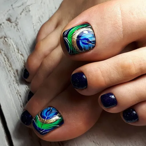 Всего один ноготь с яркой блестящей полоской-пером делает мощный акцент и усиливает впечатлении от этого дизайна в целом. Так выглядит идея для украшения ножек с характером!