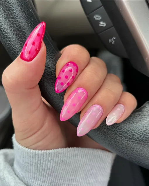 Трендовый принт полька-дот не сдаст свои позиции и этой весной. Милый рисунок в виде россыпи мелких горошинок можно сочетать как с полупрозрачными покрытиями в пастельных оттенках вроде белого и розового, так и с более яркими и хромированными основами. Не бойся экспериментировать!