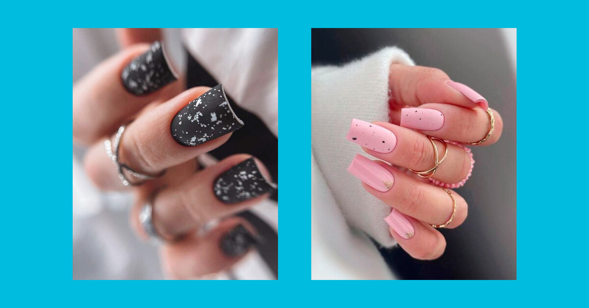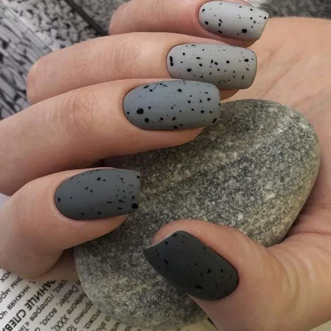 Крапчатый финиш — отличный способ выделить акцентные ногти. Попробуй также поиграть в текстурой, комбинируя матовое и глянцевое покрытия.