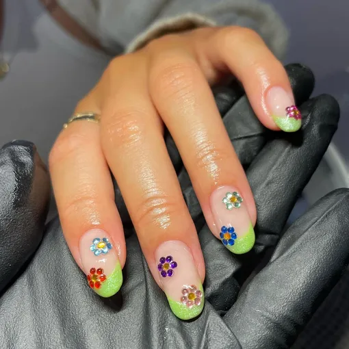 Если ты хочешь ярко встретить весну, то даем тебе простой «рецепт»: цветочные мотивы плюс сверкающие стразы на ногтях. Этот маникюр изящный и креативный, а еще выглядит как маленький букетик на каждом пальце!