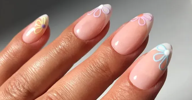 Классический французский маникюр и нежные цветочные детали поверх — все, что тебе нужно, чтобы создать образ «весна на кончиках пальцев».