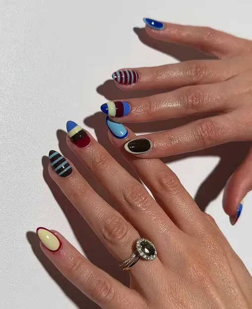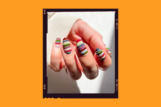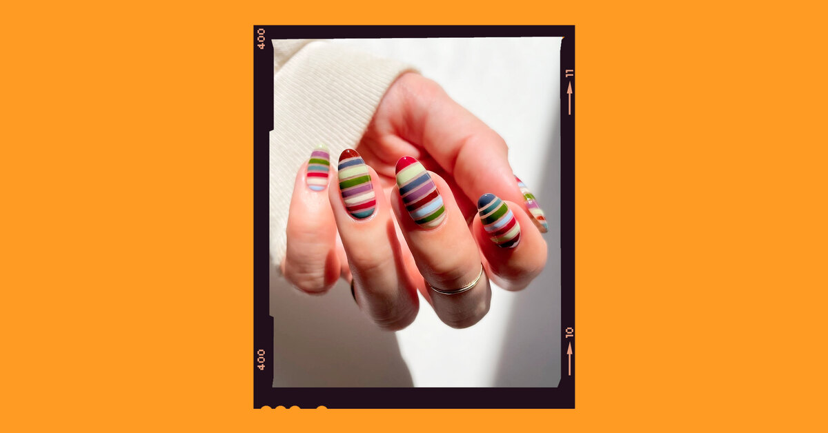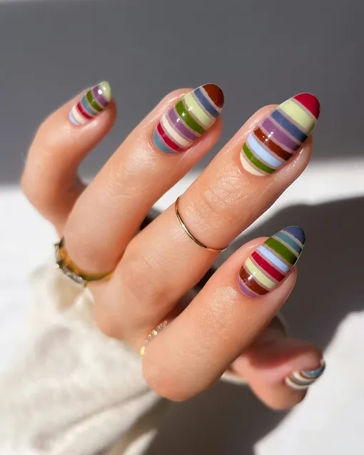 Легкий ретровайб и отсылки к пачке скитлз – все, что приходит на ум, когда смотришь на эти сочные и игривые полоски на ногтях.