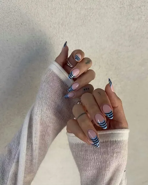 В последнее время все сходят с ума по двухцветным комбинациям в маникюре. Мы предлагаем совместить два тренда в одном дизайне, как в этом френче с полосками темно-синего и нежно-голубого цветов.