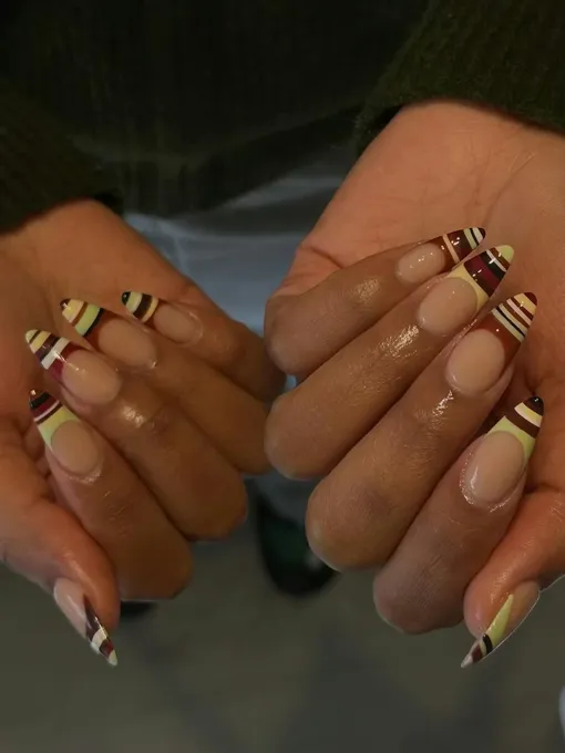 Хотя полоски в маникюре чаще всего делают яркими, они прекрасно выглядят и в приглушенных природных тонах. Этот элегантный френч с пестрыми кончиками — лучшее тому доказательство.
