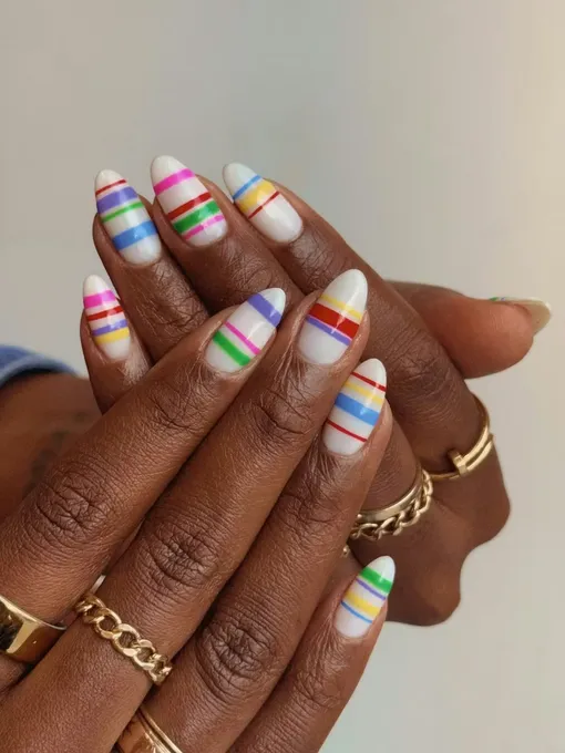 Если хочешь, чтобы разноцветные полоски выглядели максимально ярко и сочно, наноси их на белую или молочную базу для максимального контраста.