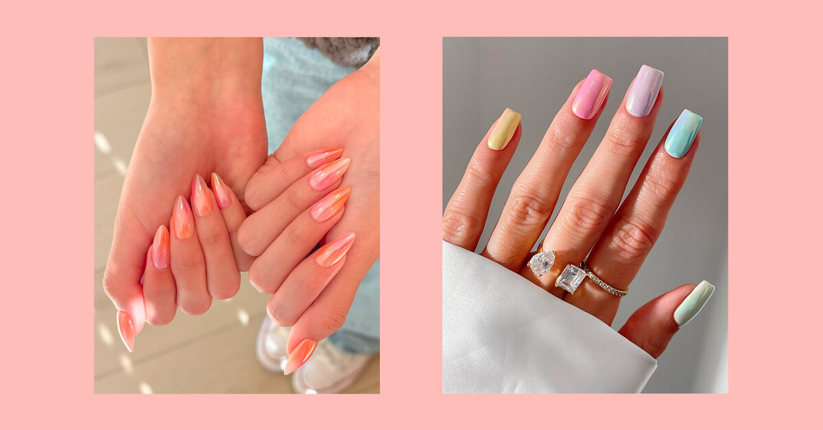 В этом году нейл-дизайны закатных цветов в тренде — они теплые, но не кричащие, яркие, но не вызывающие. «Ваш маникюр будет красиво ловить свет, не создавая ощущения слишком блестящего», — говорит Оливия.