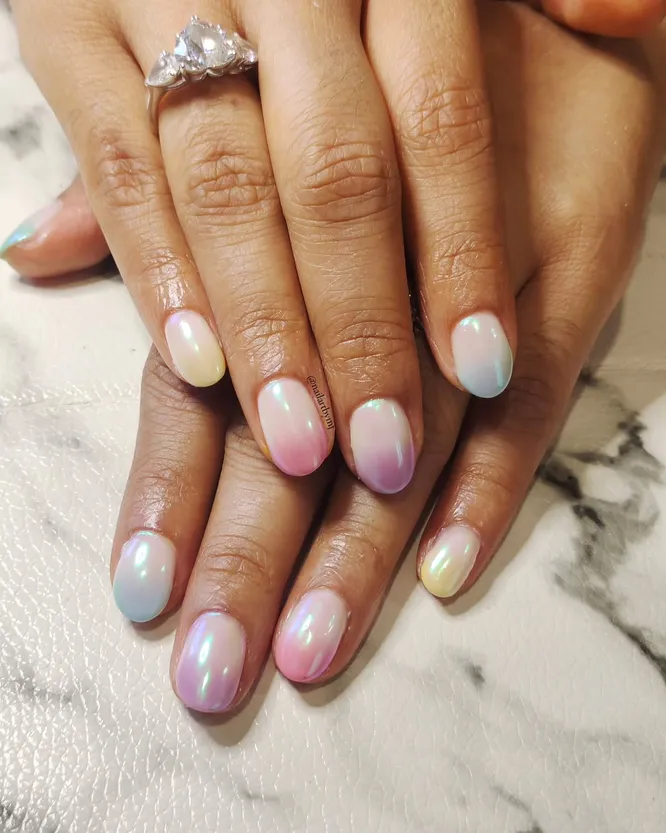 Если яркий цвет тебе не по душе, ты всё равно можете следовать тренду. Используй с хромированным верхним слоем бледно-розовую основу или вообще откажись от цвета — естественный оттенок ногтя будет имитировать нежную пастель, а опаловый блеск идеально подойдет для летних дней.